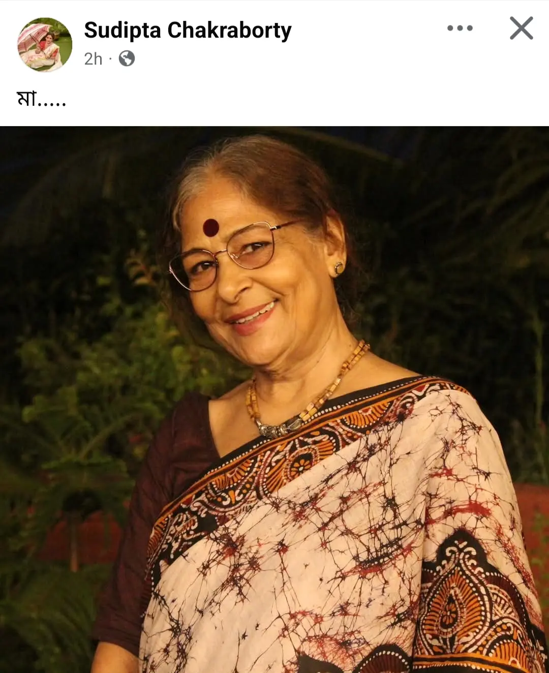 রাহুল অরুণোদয় বন্দ্যোপাধ্যায়ের মৃত্যুর পরই শোনা গিয়েছিল যে সুদীপ্তা চক্রবর্তীর মা, দীপালি চক্রবর্তী অসুস্থ। তাঁকে হাসপাতালে নিয়ে যাওয়া হয়েছে। এরপর, এদিন সকলের সঙ্গে এই দুঃসংবাদ ভাগ করে নিলেন অভিনেত্রী।