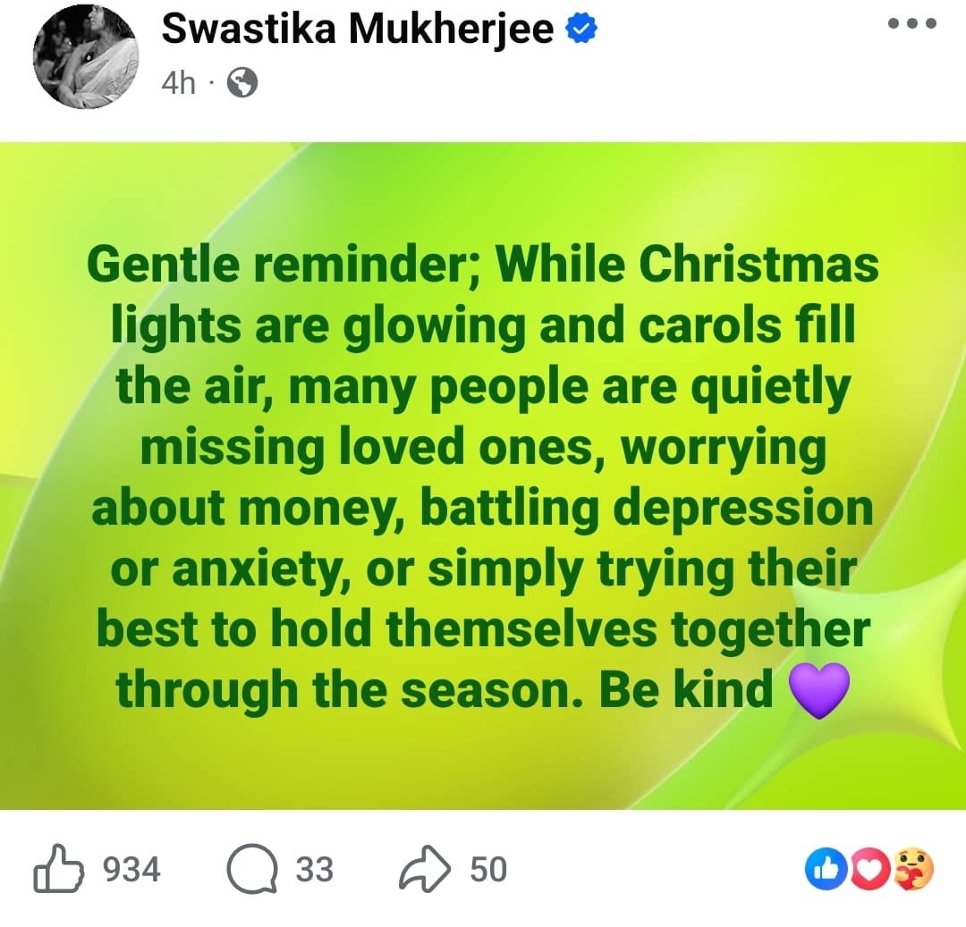 তা কী লিখেছেন অভিনেত্রী? “আপনাদের শুধু মনে করিয়ে দিই আরও একবার, ক্রিসমাস উপলক্ষে চারপাশ আলোয় সেজে উঠছে, ক্রিসমাস ক্যারোলের মিষ্টি সুরও গুনগুন করে শোনা যাচ্ছে আশেপাশে। অসংখ্য মানুষ তাঁদের প্রিয়জনদের যেমন মিস করছেন, কেউ বা অর্থের চিন্তায় দুঃসহ চিন্তায় ভুগছেন। আবার কেউ অবসাদের সঙ্গে একহাতে লড়ছেন, কেউ বা ভুগছেন গভীর বিষণ্ণতায়। আবার কেউ হয়তো নিজের কাছের মানুষকে আপ্রাণ নিজের কাছে রেখে দেওয়ার চেষ্টায় প্রাণপাত করে চলেছেন। তাই একটু দয়ালু হন।”