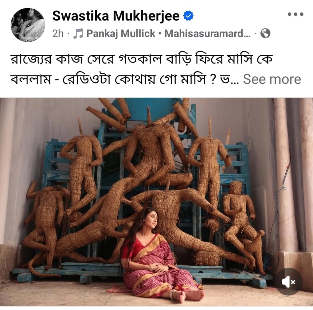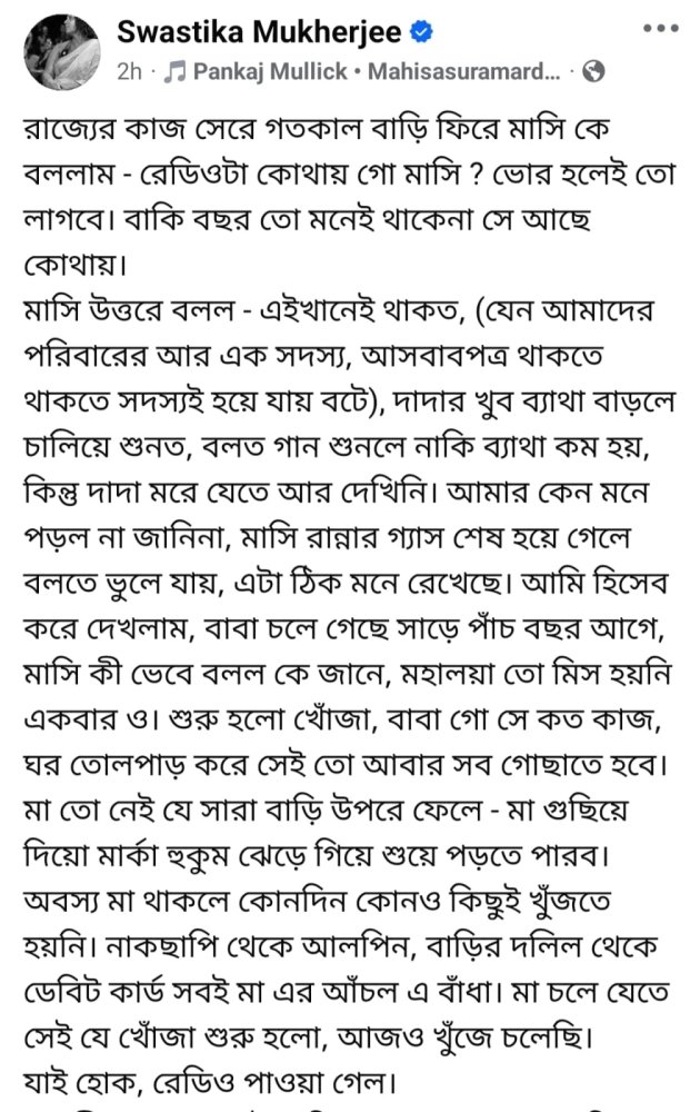 অভিনেত্রী লিখলেন - “রাজ্যের কাজ সেরে গতকাল বাড়ি ফিরে মাসি কে বললাম - রেডিওটা কোথায় গো মাসি ? ভোর হলেই তো লাগবে। বাকি বছর তো মনেই থাকেনা সে আছে কোথায়।
