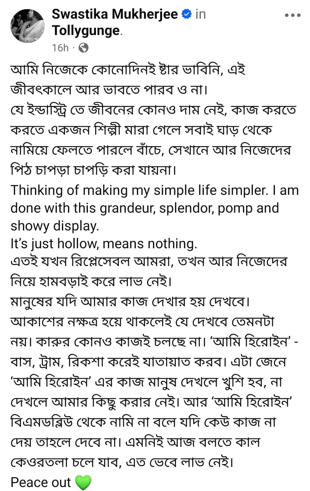 স্বস্তিকার এই ‘পিস আউট’ বার্তা এবং নিজেকে সাধারণ মানুষ হিসেবে ঘোষণা করার সিদ্ধান্ত টলিপাড়ার অনেক বড় বড় রাঘব বোয়ালদের গদি নাড়িয়ে দিয়েছে। রাহুলের মৃত্যু কি তবে টলিউডের কাজের সংস্কৃতিতে এক আমূল পরিবর্তনের সূচনা করতে চলেছে? স্বস্তিকার এই বিদ্রোহ এখন সেই পথেই ইঙ্গিত দিচ্ছে।