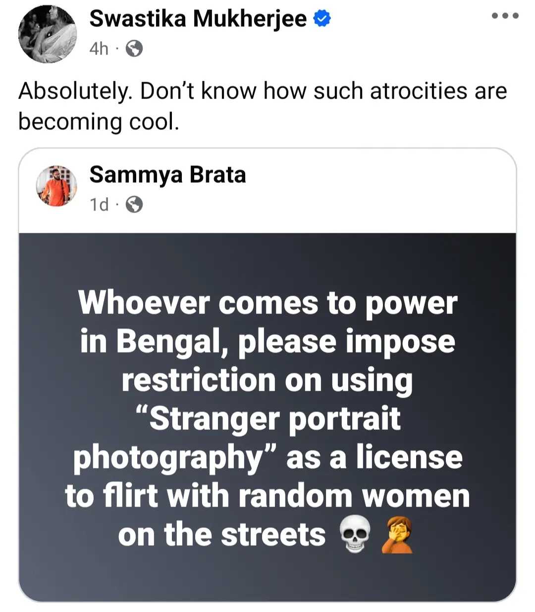 এই বিতর্ক যখন তুঙ্গে, তখনই অভিনেত্রী স্বস্তিকা মুখোপাধ্যায়ের মতো ব্যক্তিত্বদের মন্তব্য নতুন করে আলোচনার জন্ম দেয়। ব্যক্তিগত স্বাধীনতার প্রশ্নে এবং রাস্তায় নারীদের পোশাক বা চালচলন নিয়ে সমাজের যে অবদমিত দৃষ্টিভঙ্গি, তার বিরুদ্ধে বরাবরই সরব স্বস্তিকা। ‘স্ট্রেঞ্জার পোর্ট্রেট’ নিয়ে স্বস্তিকার বক্তব্য – “ক্ষমতায় যারাই আসুক, বাংলার রাস্তায় ‘স্ট্রেঞ্জার পোর্ট্রেট ফটোগ্রাফি’-র আড়ালে যে অভদ্রতা চলছে, তা বন্ধের দাবি জানাই। শিল্পের দোহাই দিয়ে মহিলাদের হেনস্থা করা কোনওভাবেই বরদাস্ত করা যায় না।” স্বস্তিকা আরও লেখেন, “কীভাবে যে এই অসভ্যতামি প্রশংসিত হচ্ছে, সেটা ভেবে পাচ্ছি না।”