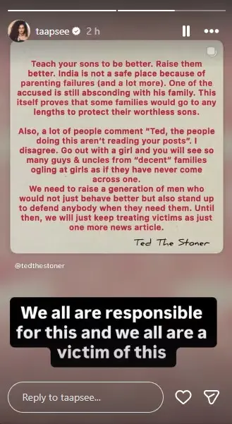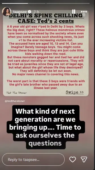 দিল্লির ভজনপুরায় ছয় বছরের এক নাবালিকা শিশুকে তিন নাবালক ছেলের যৌন নির্যাতনের ঘটনায় দেশজুড়ে আতঙ্ক ও ক্ষোভ। অভিযুক্তদের বয়স ১৩, ১৪ ও ১৫। গত ১৮ জানুয়ারি তাদের আটক করা হয়েছে। ভারতীয় ন্যায় সংহিতা ও পকসো আইনে মামলা রুজু হয়েছে।এই ঘটনায় সোশ্যাল মিডিয়ায় তীব্র প্রতিক্রিয়া জানিয়েছেন অভিনেত্রী তাপসী পন্নু ও ভূমি পেডনেকর। ইনস্টাগ্রামে একটি পোস্ট শেয়ার করে তাপসী লেখেন,“আমরা কেমন আগামী প্রজন্ম তৈরি করছি? এখনই নিজেদের প্রশ্ন করার সময়।” পরের স্টোরিতে তিনি আরও লেখেন,“আমরা সবাই দায়ী। আর আমরা সবাই এর শিকার।”