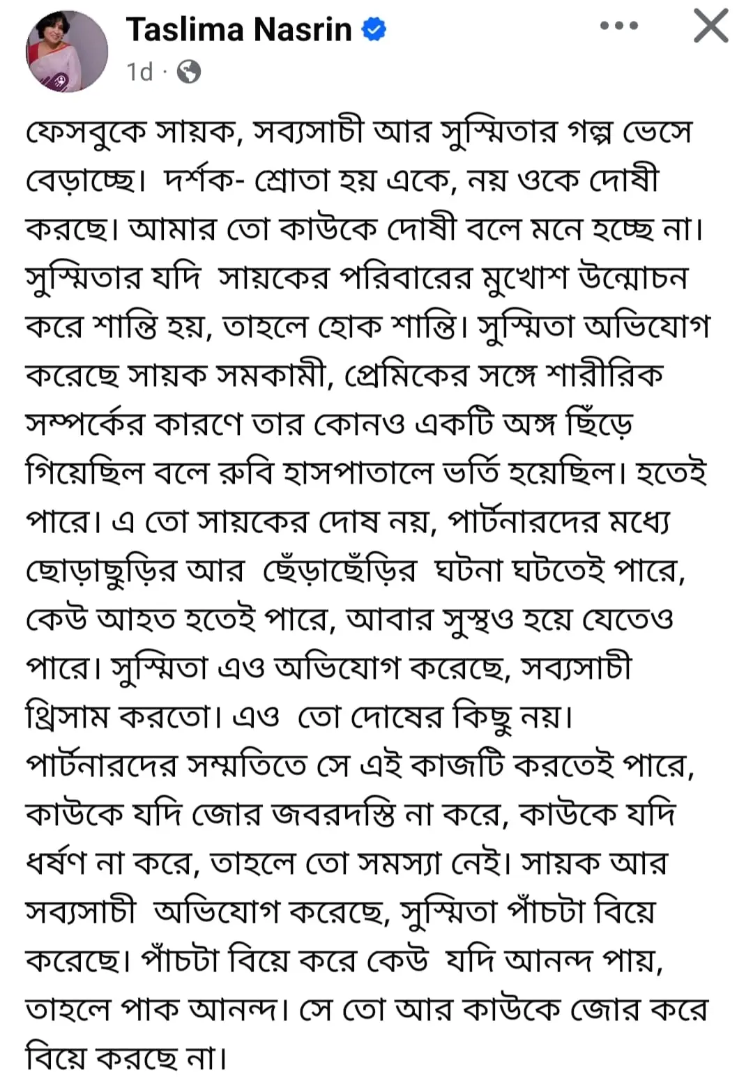 সুস্মিতার বিরুদ্ধে সব্যসাচী ও সায়কের মূল অভিযোগ ছিল তাঁর একাধিক বিয়ে নিয়ে। সেই প্রসঙ্গেও সুস্মিতার পাশেই দাঁড়িয়েছেন তসলিমা। তাঁর মতে, কেউ যদি পাঁচটা বিয়ে করে আনন্দ পায়, তবে তাতে অন্যের আপত্তি থাকার কারণ নেই। তিনি লিখেছেন, “সে তো আর কাউকে জোর করে বিয়ে করছে না।”