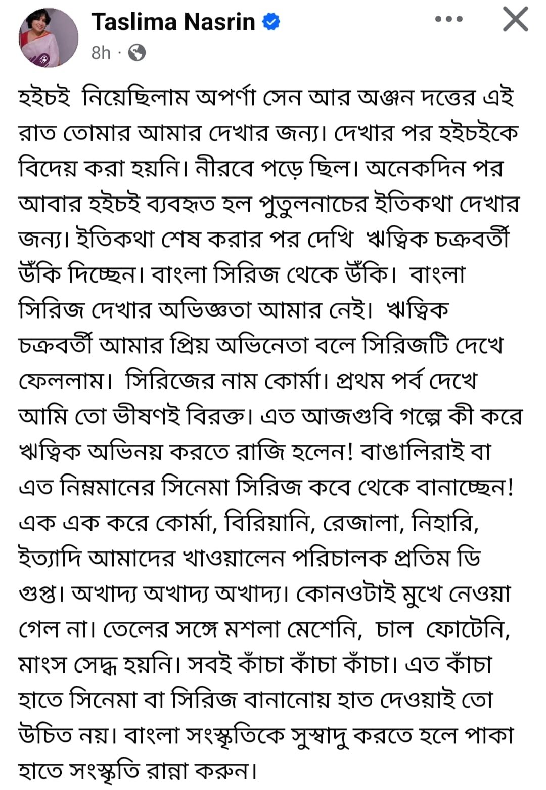তসলিমা লিখেছেন, "হইচই নিয়েছিলাম অপর্ণা সেন আর অঞ্জন দত্তের এই রাত তোমার আমার দেখার জন্য। দেখার পর হইচইকে বিদেয় করা হয়নি। নীরবে পড়ে ছিল। অনেকদিন পর আবার হইচই ব্যবহৃত হল পুতুলনাচের ইতিকথা দেখার জন্য। ইতিকথা শেষ করার পর দেখি ঋত্বিক চক্রবর্তী উঁকি দিচ্ছেন। বাংলা সিরিজ থেকে উঁকি। বাংলা সিরিজ দেখার অভিজ্ঞতা আমার নেই। ঋত্বিক চক্রবর্তী আমার প্রিয় অভিনেতা বলে সিরিজটি দেখে ফেললাম। সিরিজের নাম কোর্মা। প্রথম পর্ব দেখে আমি তো ভীষণই বিরক্ত। এত আজগুবি গল্পে কী করে ঋত্বিক অভিনয় করতে রাজি হলেন! বাঙালিরাই বা এত নিম্নমানের সিনেমা সিরিজ কবে থেকে বানাচ্ছেন! এক এক করে কোর্মা, বিরিয়ানি, রেজালা, নিহারি, ইত্যাদি আমাদের খাওয়ালেন পরিচালক প্রতিম ডি গুপ্ত। অখাদ্য অখাদ্য অখাদ্য। কোনওটাই মুখে নেওয়া গেল না। তেলের সঙ্গে মশলা মেশেনি, চাল ফোটেনি, মাংস সেদ্ধ হয়নি। সবই কাঁচা কাঁচা কাঁচা। এত কাঁচা হাতে সিনেমা বা সিরিজ বানানোয় হাত দেওয়াই তো উচিত নয়। বাংলা সংস্কৃতিকে সুস্বাদু করতে হলে পাকা হাতে সংস্কৃতি রান্না করুন।"