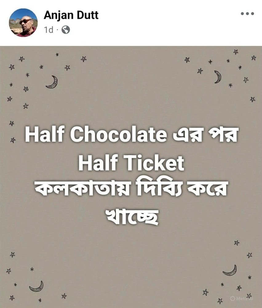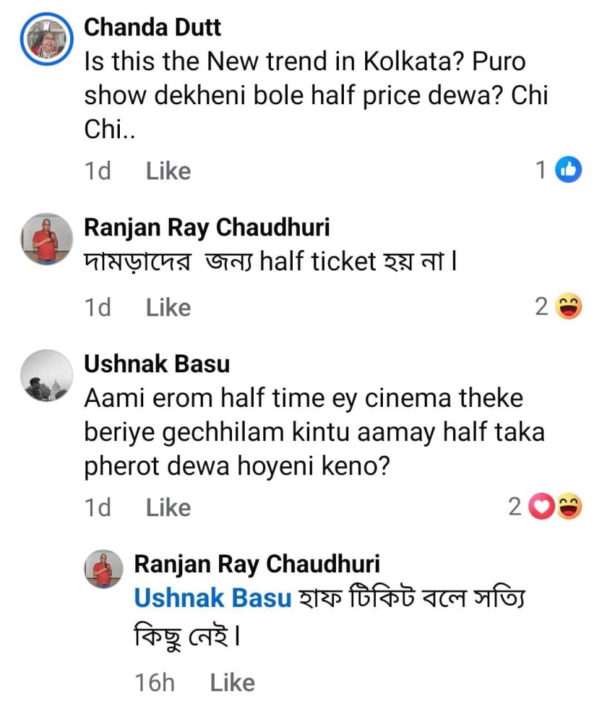 কানাঘুষো, সেই পরিচালক একটা সময় নাকি অঞ্জনেরও কাছের মানুষ ছিলেন। তবে সেই তাল কেটেছে। স্বভাবতই ওই পরিচালকের এহেন কাণ্ডে মর্মাহত এবং ঈষৎ ক্ষুব্ধ অঞ্জন। তারই ফলাফল নাকি ফেসবুকে বেলা বসের প্রেমিক এর এই পোস্ট! অঞ্জন দত্ত যদিও পোস্টের বার্তা বাক্স অফ করে দিয়েছেন, তবু তার মধ্যেই বেশ কিছু ধারালো কমেন্ট এসে জড়ো হয়েছে সেই পোস্টে। একজন লিখেছেন, “এই ব্যাপারটা কি কলকাতার নতুন ট্রেন্ড? পুরো শো দেখেননি বলে অর্ধেক টাকা দেওয়া? ছি ছি।” নজর কেড়েছে আরও এক নেটপাড়ার সদস্যের বার্তা – “হাফ টিকিট বলে সত্যি কিছু নেই!”