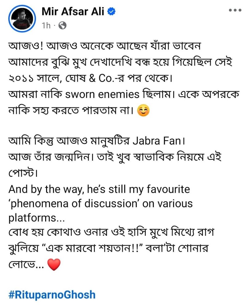 স্রেফ একটা অনুষ্ঠান তাঁদের মধ্যে কয়েক রাজ্যের দূরত্ব বাড়িয়েছিল। ঋতুপর্ণ ঘোষকে ‘নকল’ করেছিলেন জনপ্রিয় সঞ্চালক মীর আফসার আলি। তাতে মনে মনে ধাক্কা খেয়েছিলেন প্রয়াত পরিচালক। বলেছিলেন, “মীর আদতে তাঁর মতো বিশেষ আত্মপরিচয়ের মানুষদের ব্যঙ্গ করেছেন। সেই নিয়ে নাকি দু'টি শিবিরে ভাগ হয়ে গিয়েছিল বাংলা বিনোদন জগৎ! এর পরে একটি চ্যানেলে টক শো সঞ্চালনা করেছিলেন ঋতুপর্ণ ঘোষ। নাম ছিল, ‘ঘোষ অ্যান্ড কোম্পানি’। সেখানে তিনি মীরের সঙ্গে যে ভাবে কথা বলেছিলেন, ভাল লাগেনি অভিনেতা-সঞ্চালকের। পরিচালকের যুক্তি ছিল, তিনি যেহেতু বিশেষ শ্রেণিভুক্ত তাই মীরের এই ধরনের অনুষ্ঠানে ওই বিশেষ শ্রেণির মানুষেরা আহত হতে পারেন। ঋতুপর্ণ তাই অনুরোধ জানিয়েছিলেন, আগামী দিনে মীর আবারও তাঁর নকল করলে যেন পরিচালকের নাম উল্লেখ করে দেন। তিনি কিচ্ছু মনে করবেন না।সেই সম্প্রচারিত পর্ব দেখে চোখ কপালে উঠেছিল দর্শকের। নড়চড়ে বসেছিল গোটা টলিপাড়া। তবে একটা সময়ের পর এই দুই শিল্পীর মধ্যে থাকা সেই দূরত্বও মুছে গিয়েছিল। সেই অভিমান নিজেই মুছে দিয়েছিলেন ঋতুপর্ণ। সেকথা জানিয়েছিলেন মীর। রবিবার, পরিচালকের জন্মবার্ষিকীতে সেই স্মৃতি ফের সজীব মীরের ফেসবুক বয়ানে।