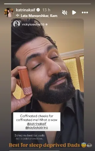 গত বুধবার ভিকি কৌশল তাঁর ইনস্টাগ্রাম স্টোরিতে নিজের একটি ছবি পোস্ট করেন। ছবিতে দেখা যায়, তিনি ক্যাটরিনার ব্র্যান্ডের নতুন ‘জেলি লিপ অ্যান্ড চিক ওয়ান্ড’ ব্যবহার করেছেন। মজার ছলে ভিকি ক্যাপশনে লেখেন, “আমার ক্যাফিনেটেড গালের জন্য ক্যাফিনেটেড আমি! কী দারুণ।” সঙ্গে তিনি আরও লেখেন, “অনেক চেষ্টা করলাম, কিন্তু দুঃখের বিষয়, এই প্রচারটা কিন্তু পয়সা নিয়ে করছি না।”