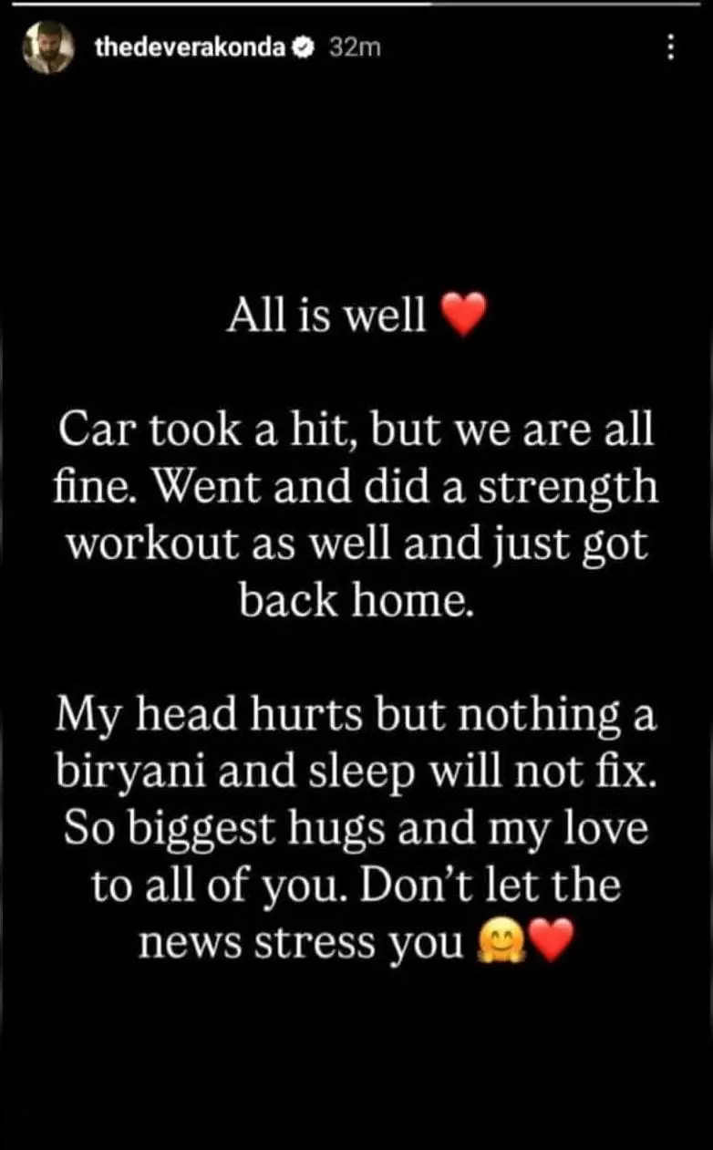 ঘটনাস্থলে উপস্থিত থাকা সত্ত্বেও সৌভাগ্যবশত বিজয় দেবেরকোন্ডা অক্ষত আছেন। গাড়িতে তিনি ছাড়াও আরও দু'জন ছিলেন এবং তাঁরাও সুরক্ষিত। পুলিশের মতে, আকস্মিক মোড় নেওয়ার কারণেই এই সংঘর্ষ হয় এবং বিজয়ের গাড়িতে সামান্য ক্ষতি হয়েছে। দুর্ঘটনার পরপরই অভিনেতা অন্য একটি গাড়িতে করে গন্তব্যের দিকে রওনা হন এবং তাঁর টিম ইন্স্যুরেন্সের জন্য পুলিশের কাছে অভিযোগ দায়ের করে।