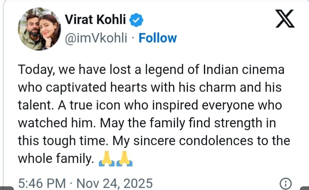 ধর্মেন্দ্রর প্রয়াণে শোকবার্তা জানান প্রাক্তন অলরাউন্ডার যুবরাজ সিংও। তিনি লেখেন, “প্রতিটি ঘরেই ছিল এক প্রিয় ধর্মেন্দ্র ছবি। আমাদের বড় হয়ে ওঠার স্মৃতিতে তিনি অমলিন।”