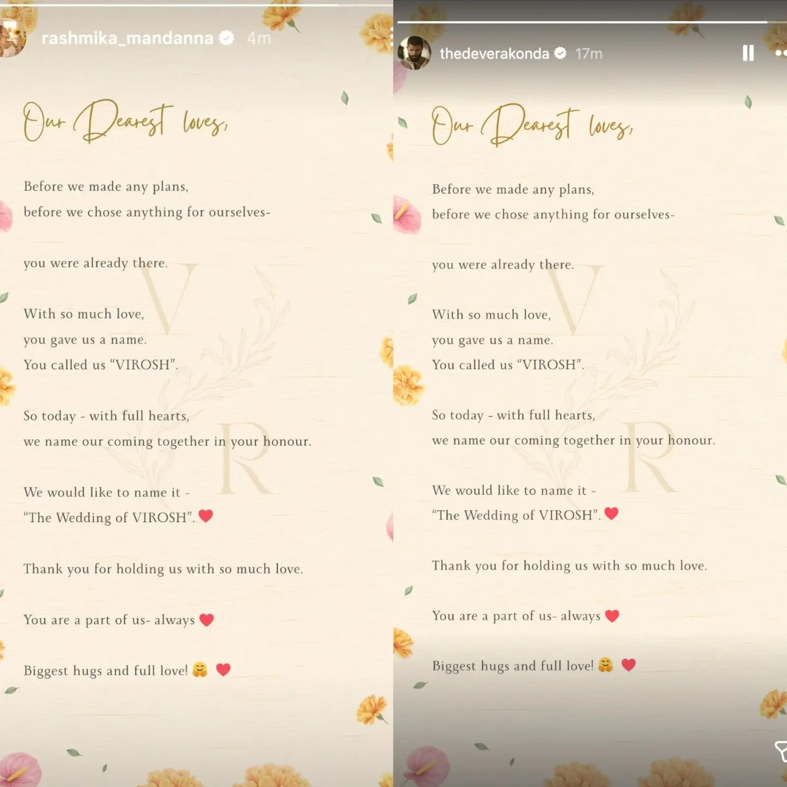 তাঁদের বার্তায় স্পষ্ট, ভক্তরাই তাঁদের সম্পর্কের পরিচয় তৈরি করেছিলেন -‘ভিরোশ’ নামটি দিয়েছিলেন অনুরাগীরাই। সেই কারণেই তাঁদের আসন্ন বিবাহকে তাঁরা নাম দিয়েছেন “দ্য ওয়েডিং অফ ভিরোশ”। ভালবাসা ও সমর্থনের জন্য ভক্তদের ধন্যবাদ জানিয়ে লিখেছেন, এই যাত্রায় সবাই তাঁদের অংশ হয়ে থাকবেন।