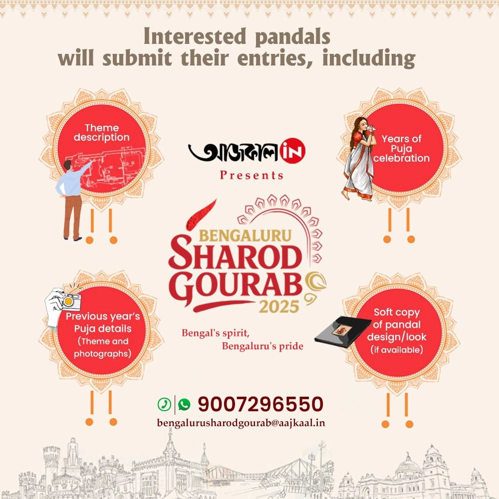 বাঙালির দুর্গোৎসব মানেই শুধু কলকাতার অলিগলি, ঠাকুরঘর আর থিমপুজোর ঝলক নয়। এবার সেই পরিধি ছাপিয়ে যাচ্ছে সুদূর বেঙ্গালুরু পর্যন্ত! প্রথমবারের মতো এই শহরের পুজোগুলিকে জাতীয় মঞ্চে স্বীকৃতি দিতে চলেছে ‘শারদ গৌরব পুরস্কার ২০২৫’। আয়োজক আজকাল ডট ইন। বেঙ্গালুরুতে বর্তমানে প্রায় দু’শোর বেশি দুর্গাপুজো হয়। বহুমাত্রিক থিম, সৃজনশীলতার ঝলক আর প্রবাসী বাঙালির আবেগ - এই তিনে মিলে প্রতিটি মণ্ডপ হয়ে ওঠে অনন্য শিল্পকর্ম। কিন্তু এতদিন এই বর্ণাঢ্য আয়োজন, অনুষ্ঠানের স্বীকৃতি সীমাবদ্ধ ছিল স্রেফ স্থানীয় পরিসরে। ‘শারদ গৌরব’ সেই সীমারেখা ভেঙে কলকাতাসহ গোটা দেশের বাঙালির সামনে তুলে ধরবে বেঙ্গালুরুর দুর্গোৎসবের ঐশ্বর্য।