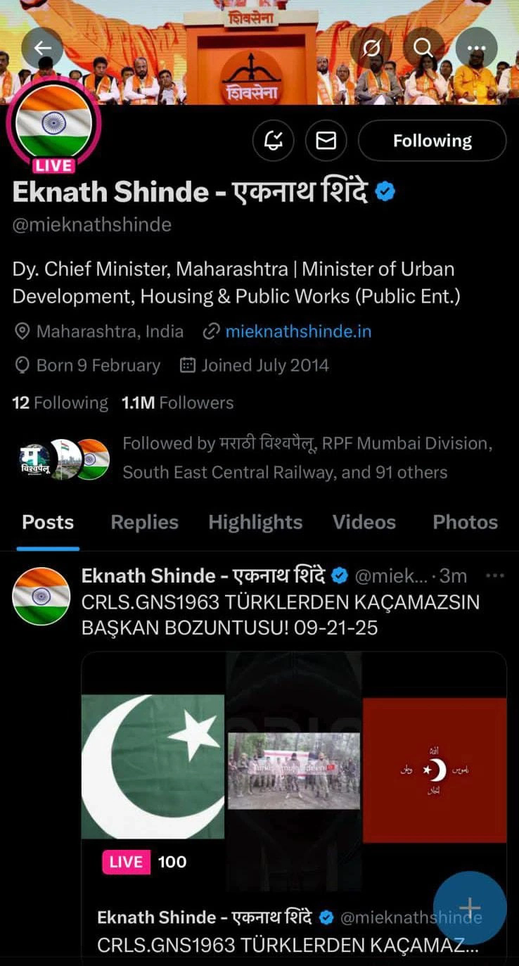 আজকাল ওয়েবডেস্ক: রবিবার সকালে আচমকাই হ্যাক হল মহারাষ্ট্রের উপমুখ্যমন্ত্রী একনাথ শিন্ডের এক্স হ্যান্ডেল। জানা গিয়েছে, মহারাষ্ট্রের উপমুখ্যমন্ত্রীর এক্স অ্যাকাউন্ট রবিবার সকালে হ্যাক হয়ে যায়। সেখান থেকে হ্যাকাররা একাধিক পোস্টও করে। দেখা যায়, একনাথ শিন্ডের অ্যাকাউন্ট থেকে পাকিস্তান ও তুরস্কের পতাকার ছবি পোস্ট করা হয়েছে। এছাড়াও, ভারত-পাকিস্তান এশিয়া কাপ ম্যাচের আগে হঠাৎ ওই অ্যাকাউন্ট থেকে দুই দেশের প্রতীক চিহ্ন যুক্ত কনটেন্ট লাইভস্ট্রিমও করা হয় বলে জানা গেছে। একজন আধিকারিক জানান, ‘আমরা সঙ্গে সঙ্গেই সাইবার ক্রাইম থানার পুলিশকে বিষয়টি জানাই।