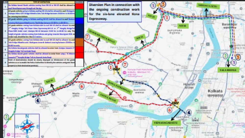১. বিদ্যাসাগর সেতু এবং এর র্যাম্প, বাসকুল সেতু থেকে পূর্ব দিকে সিজিআর রোড, গার্ডেন রিচ রোড, এই প্রধান সড়কগুলিকে সংযুক্তকারী অন্যান্য সমস্ত ফিডার রোড দিয়ে ভারী পণ্যবাহী যানবাহন এবং মাঝারি পণ্যবাহী যানবাহন সকাল ৬.০০ টা থেকে রাত ৯.০০ টা পর্যন্ত নিষিদ্ধ থাকবে।