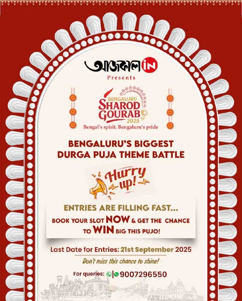 আজকাল ওয়েবডেস্ক: শুধু কলকাতা নয়, এখন বেঙ্গালুরুর দুর্গাপুজো মানেও থিমের ঘনঘটা। শহর জুড়ে ছড়িয়ে থাকা বারোয়ারি পুজোগুলি এ বারও তাঁদের ভাবনায় একে অপরকে টেক্কা দিতে প্রস্তুত। কোথাও সাবেকিয়ানার সঙ্গে মিশেছে আধুনিকতার ছোঁয়া, তো কোথাও আবার কর্ণাটকের লোকশিল্পের সঙ্গে বাংলার ঐতিহ্যের মেলবন্ধন ঘটছে। আর এই সব পুজোকে সম্মান জানাতে বেঙ্গালুরুতে হাজির আজকাল ডট ইন। প্রথমবার আয়োজিত হতে চলেছে আজকাল ‘শারদ গৌরব’-এর আসর। এক নজরে দেখে নেওয়া যাক শহরের সেরা পুজোগুলির থিম।