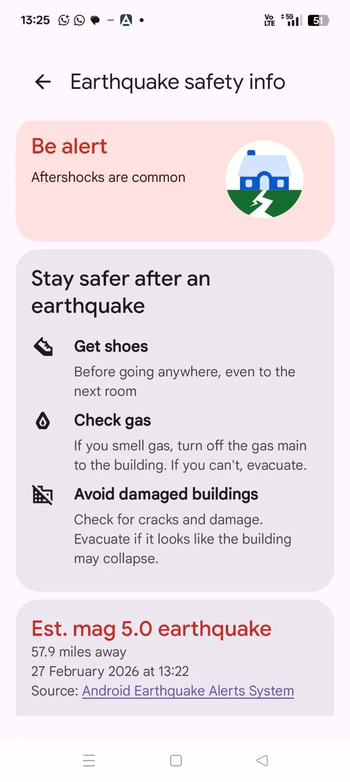 গুগলের তরফে অ্যান্ড্রয়েড আর্থকোয়েক অ্যালার্ট সিস্টেম আনা হয়েছে অ্যান্ড্রয়েড স্মার্টফোনের জন্য। এই ফিচারের জন্য উক্ত সংস্থা ব্যবহারকারীদের ফোনকেই একটি ছোট সিসমোমিটার হিসেবে ব্যবহার করে থাকে ভূমিকম্প আসছে কিনা, বা ঘটবে কিন বোঝার জন্য। এবং কিছুটা হলেও আগে থেকে সেই অ্যালার্ট পাঠাবে। যাতে ব্যবহারকারীরা কোনও নিরাপদ স্থানে সরে যেতে পারেন। কেবল তাঁর ফোন নয়, আশেপাশের ডিভাইস থেকেও ডেটা নিয়ে জানিয়ে দেবে ভূমিকম্পের উৎসস্থল কী এবং কত ম্যাগনিটিউডের ভূমিকম্প ঘটল।