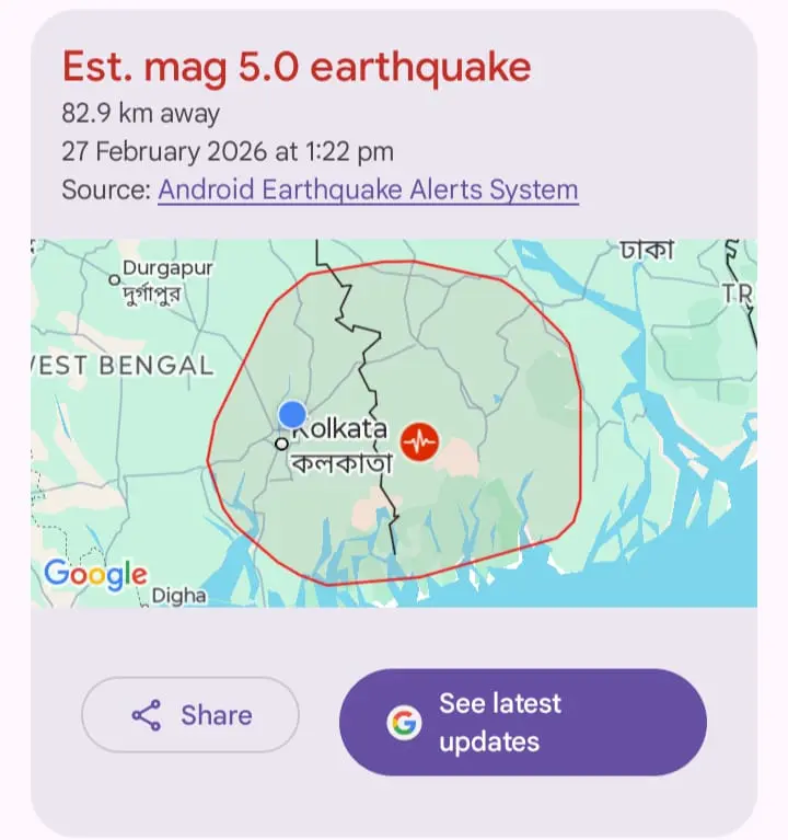 প্রেমের মাস শেষ হওয়ার আগে ভূমিকম্প কাঁপিয়ে দিয়ে গেল কলকাতাকে। ২৭ ফেব্রুয়ারি বেলা সাড়ে বারোটার দিকে ৫.০ রিখটার স্কেলে ভূমিকম্প অনুভূত হয় কলকাতা এবং পার্শ্ববর্তী অঞ্চলে। উৎসস্থল খুলনার কাছাকাছি। এই ঘটনার পর একদিকে যেমন আতঙ্কের পরিবেশ তৈরি হয়েছে মানুষের মধ্যে, তেমনই বেশ কিছু নাগরিকের ফোন আগেভাগেই নোটিফিকেশন পাঠিয়ে দিয়েছিল ভূমিকম্প যে হতে পারে তার। পরের বার এমন কোনও ঘটনা ঘটলে আপনিও পেতে পারেন এই নোটিফিকেশন। কী করবেন তার জন্য? জেনে নিন।