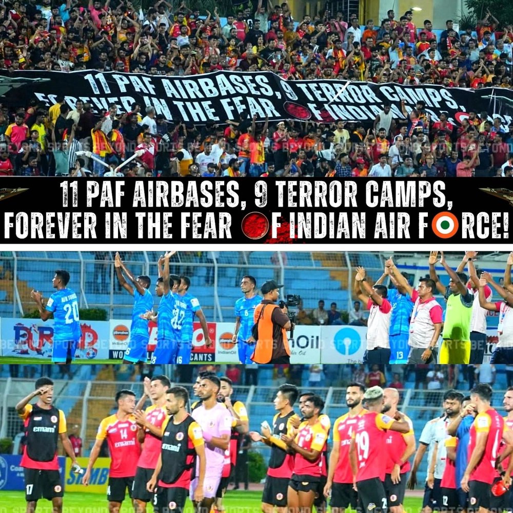 অপারেশন সিঁদুরে উল্লেখযোগ্য ভূমিকা রেখেছিল ভারতীয় বায়ুসেনা। সে কারণে এদিন বায়ুসেনাকে শ্রদ্ধা জানিয়ে বিশেষ টিফো নামিয়েছিল ইস্টবেঙ্গল আল্ট্রাস। প্রতিপক্ষ হলে কি হবে, ম্যাচের পর লাল হলুদ সমর্থকদের ধন্যবাদ জানালেন বায়ুসেনার ফুটবলাররা। ৯০ মিনিটের লড়াই মাঠের মধ্যেই। কিছুদিন আগে বাংলা ভাষার ওপর অত্যাচারের প্রসঙ্গ তুলে যুবভারতীতে টিফো নামিয়েছিল ইস্টবেঙ্গল। এদিন প্রতিপক্ষকে শ্রদ্ধা জানিয়ে আরও একবার সকলের মন করে নিলেন সমর্থকরা।