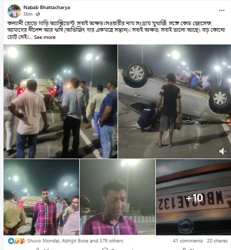 ইউনাইটেড কর্তা নবাব ভট্টাচার্য সোশ্যাল মিডিয়ায় পোস্ট করে লিখেছেন এই দুর্ঘটনার কথা। নবাব লিখেছেন, ''কল্যাণী রোডে গাড়ি অ্যাক্সিডেন্ট, সবাই অক্ষত। সওয়ারীর নাম সংগ্রাম মুখার্জি, সঙ্গে কোচ জোসেফ, আমাদের নীলেশ আর ঋষি (অভিজিৎ দার একমাত্র সন্তান)। সবাই অক্ষত, সবাই ভালো আছে। বড় কোনো চোট নেই।