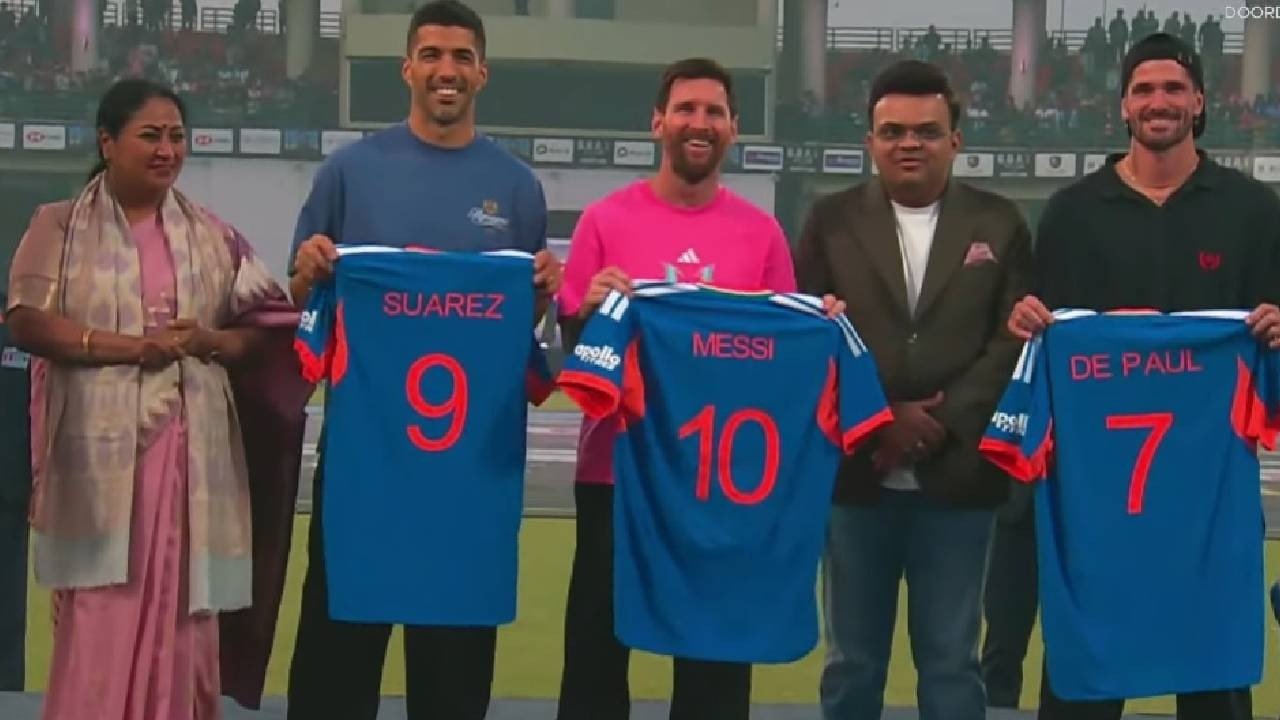 দিল্লির মুখ্যমন্ত্রী রেখা গুপ্তার সঙ্গে মাঠে আসেন আইসিসি চেয়ারম্যান জয় শাহ। মেসিরা তখন মঞ্চে দাঁড়িয়ে। জয় শাহ মেসিকে ১০ নম্বর জার্সি, সুয়ারেজকে ৯ নম্বর ও দি পলকে ৭ নম্বর জার্সি উপহার দেওয়া হয়। জয় শাহ ভারত-আমেরিকা ম্যাচের টিকিট তুলে দিলেন মেসির হাতে। সেই সঙ্গে ২০২৪ সালের টি-টোয়েন্টি বিশ্বকাপের চ্যাম্পিয়ন দলের ক্রিকেটারদের সই সম্বলিত স্পেশাল ব্যাট তুলে দেওয়া হয় আর্জেন্টাইন মহাতারকার হাতে।