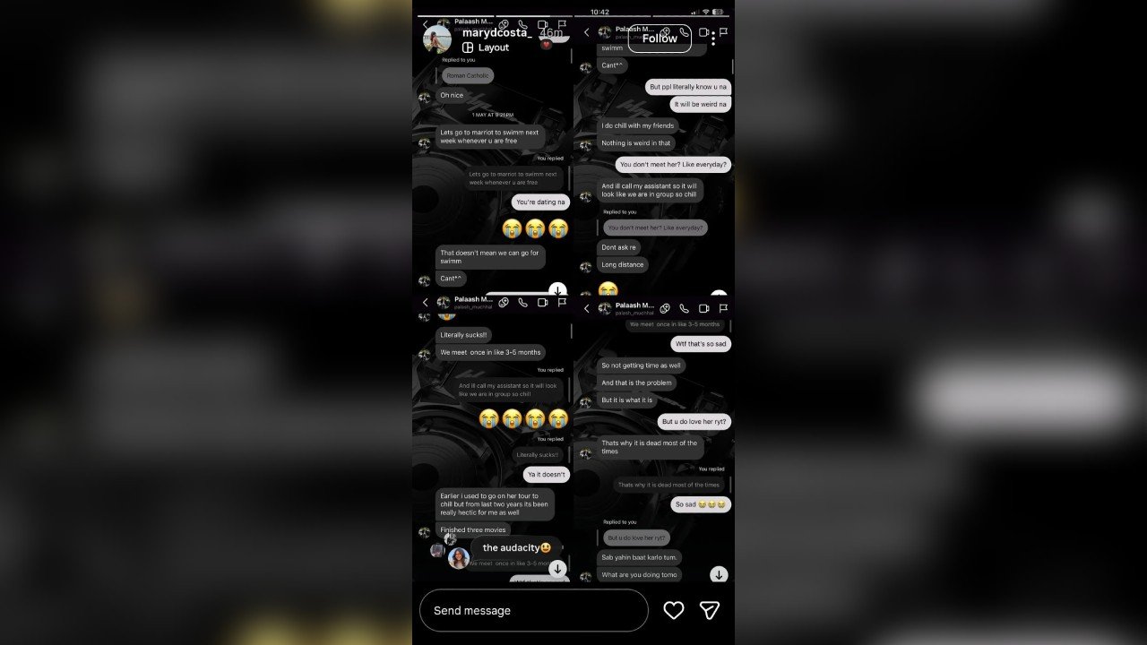 এর পরেই সোশ্যাল মিডিয়ায় গুঞ্জন ছড়াতে শুরু করে। একাধিক প্রতিবেদনে দাবি করা হয়, বিয়ের আগে পলাশ এক তরুণীর সঙ্গে ‘দুষ্টু-মিষ্টি’ কথোপকথনে জড়িত ছিলেন। সেই চ্যাটের একটি স্ক্রিনশটও ভাইরাল হয়েছে সোশ্যাল মিডিয়ায়।