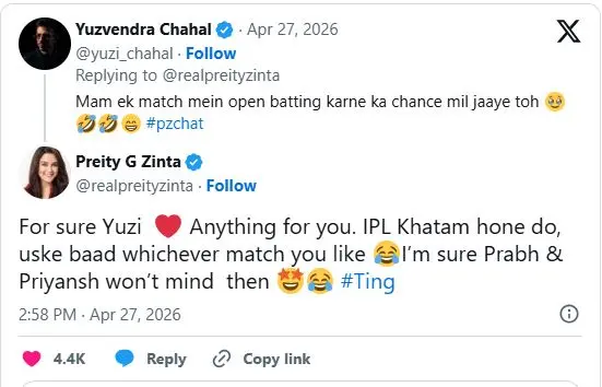 চহাল লেখেন, ''ম্যাম, এক ম্যাচে ওপেন করার একটা সুযোগ পেলে ভাল হয়।'' প্রীতিও মজার ছলে চহালের অনুরোধের উত্তর দেন। তিনি বলেন,''আইপিএল শেষ হওয়ার পর যে কোনও ম্যাচে ওপেন করতে পারো। প্রভসিমরন ও প্রিয়াংশ এতে আপত্তি জানাবে বলে মনে হয় না।''
