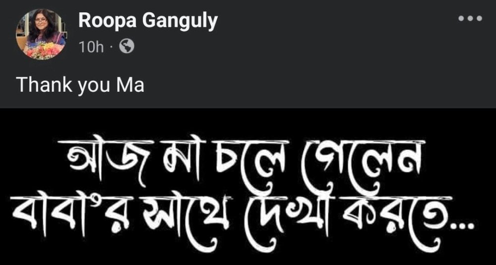 সেদিনই শেষকৃত্য সম্পন্ন করে সমাজমাধ্যমে মায়ের মৃত্যুর খবর ভাগ করেন রূপা গঙ্গোপাধ্যায়। তিনি লেখেন, 'মা চলে গেলেন বাবার সঙ্গে দেখা করতে।' তাঁর এই পোস্টে শোক জ্ঞাপন করেছেন টলিপাড়ার বহু তারকা। জানা যায়, মায়ের শেষ সময়ে তাঁকে আরও বেশি করে সময় দেওয়ার চেষ্টা করতেন রূপা। একা হাতেই মেয়েকে বড় করেছিলেন অভিনেত্রীর মা। মধ্যবিত্ত সংসারে অভাবের মধ্যেও দিন কেটেছে তাঁদের। কিন্তু কখনও সন্তানকে বুঝতে দেননি সেই কষ্টের কথা। নিজের জীবনেও বহু লড়াই ছিল, এ কথা বহুবার সাক্ষাৎকারে জানিয়েছিলেন রূপা গঙ্গোপাধ্যায়।