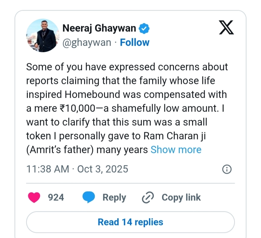 এই পরিস্থিতিতে এবার মুখ খুললেন 'হোমবাউণ্ড' ছবির পরিচালক নীরজ ঘেওয়ান। সোশ্যাল মিডিয়ায় (এক্স-এ) প্রকাশিত এক বিবৃতিতে তিনি জানান, ১০ হাজার টাকা তিনি বহু বছর আগে অমৃতের বাবা রামচরণকে ব্যক্তিগতভাবে দিয়েছিলেন। সেটি ছিল কেবলই এক “পার্টিং জেশ্চার”—অর্থাৎ সাক্ষাৎ শেষে দেওয়া এক ছোট্ট উপহার, কোনওভাবেই আসল পারিশ্রমিক নয়।