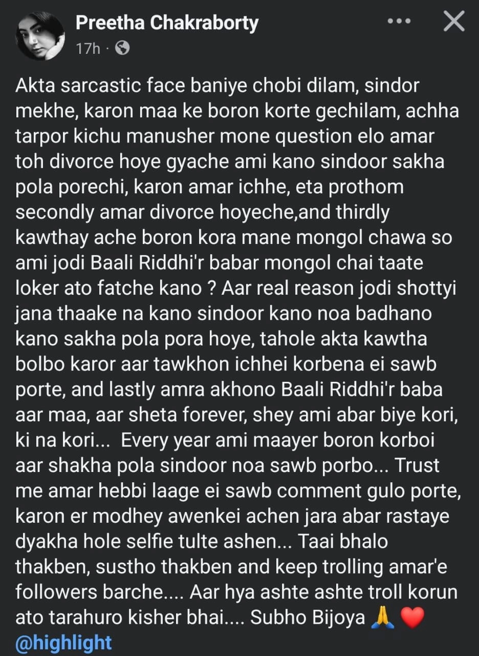 পৃথা লেখেন,'দ্বিতীয়ত, আমার ডিভোর্স হয়েছে। এবং তৃতীয়ত, কথায় আছে বরণ করা মানে মঙ্গল চাওয়া। তাই, আমি যদি বালি ও ঋদ্ধির বাবার মঙ্গল চাই! আর আসল কারণ যদি সত্যি জানা থাকে না কেন সিঁদুর, কেন নোয়া বাঁধন, কেন শাখা, পলা পরা হয়, তাহলে একটা কথা বলব—কারওর আর তখন ইচ্ছেই করবে না এই সব পরতে। এবং শেষ কথা হল, আমরা এখনও বালি ও ঋদ্ধির বাবা আর মা, আর সেটা চিরকালের জন্য। সে আমি আবার বিয়ে করি, কী না করি... প্রতি বছর আমি মায়ের বরণ করবই আর শাখা, পলা, সিঁদুর, নোয়া সব পরব...।'