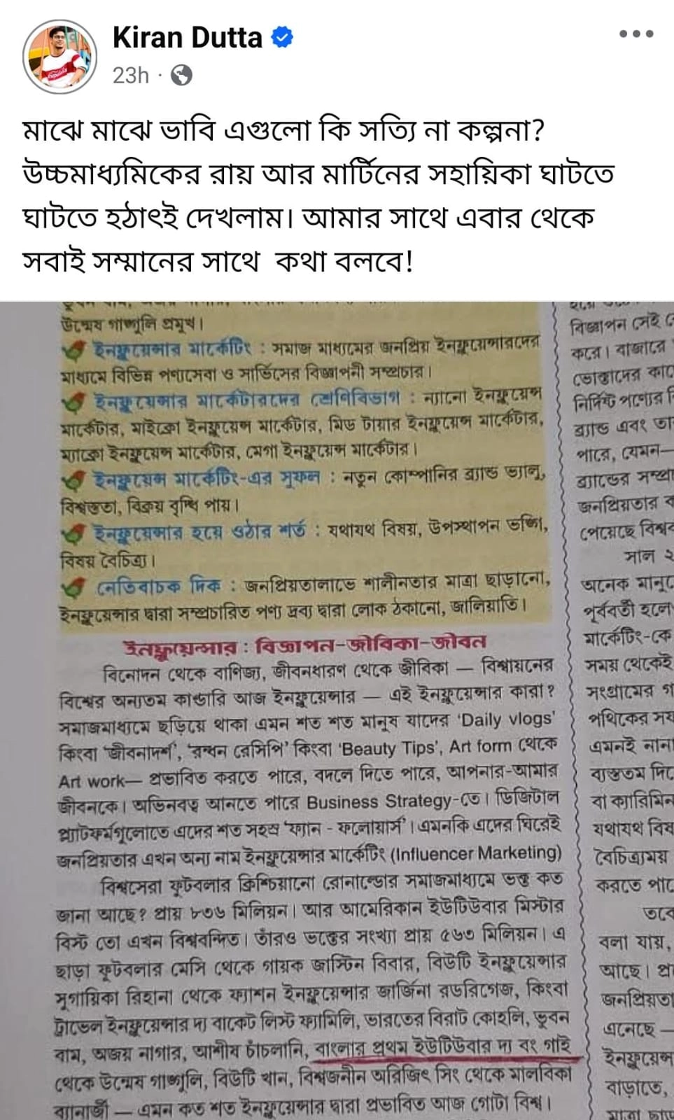 এক জনপ্রিয় প্রকাশনার উচ্চ মাধ্যমিক সহায়িকায় একটি অধ্যায় আলোচনা করা হয়েছে ইউটিউবের এবং নেটমাধ্যমের ইনফ্লুয়েন্সারদের নিয়ে। তাঁদের জনপ্রিয়তা যেমন অসিলোচনা করা হয়েছে তেমনই বলা হয়েছে এই পেশার ইতিবাচক ও নেতিবাচক দিকগুলোও। সেখানেই উল্লেখ করা হয়েছে কিরণের নাম বাংলার প্রথম ইউটিউবের হিসেবে! বইয়ের পাতার সেই অংশটি লাল কালি দিয়ে দাগিয়ে ফেসবুকে পোস্ট করেছেন ‘বং গাই’। এবং সঙ্গে লিখেছেন,
