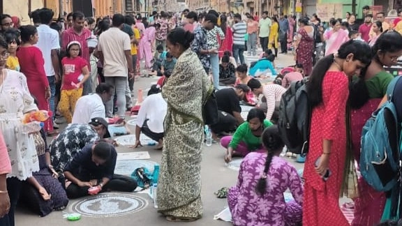মিল্টন সেন, হুগলি,১৯ অক্টোবর: ঘন্টা খানেকের মধ্যে বিস্তীর্ণ রাস্তার রূপ পাল্টে গেলো। অপরূপ হয়ে উঠলো চন্দননগর স্টেশন রোড। একাধিক শিল্পীর তুলির টানে ফুটে উঠল নানান আলপনা। জগদ্ধাত্রী আহ্বানে চন্দননগর বাগবাজার বারোয়ারীর এই উদ্যোগকে সাধুবাদ জানালেন পথচারী থেকে সাধারণ সকলেই। অনেক আগেই কাঠামো পুজোর মাধ্যমে জগদ্ধাত্রী পুজোর কাউন্টডাউন শুরু হয়েছিল আলোর শহর চন্দননগরে। দীপাবলির আগেই এবার রাস্তায় আলপনা এঁকে উৎসবের সুর বেঁধে দিলো বাগাবাজার সর্বজনীন। চন্দননগর এবং ভদ্রেশ্বরে ১৮০ টি জগদ্ধাত্রী পুজো হয়। পূজগুলির মধ্যে অন্যতম বাগবাজার বারোয়ারী।