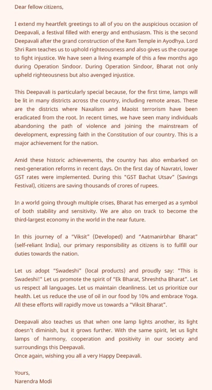 চিঠিতে প্রধানমন্ত্রী লিখেছেন, “আমি আপনাদের সকলকে শক্তি ও উৎসাহে ভরা দীপাবলির আন্তরিক শুভেচ্ছা জানাই। অযোধ্যায় রাম মন্দিরের নির্মাণের পর এটি দ্বিতীয় দীপাবলি। ভগবান শ্রী রাম আমাদের ধার্মিক অক্ষুণ্ণতা বজায় রাখার শিক্ষা দেন এবং অন্যায়ের বিরুদ্ধে লড়াই করার সাহসও দেন। কয়েক মাস আগে অপারেশন সিন্দুরের সময় আমরা এর উদাহরণ দেখেছি।”
