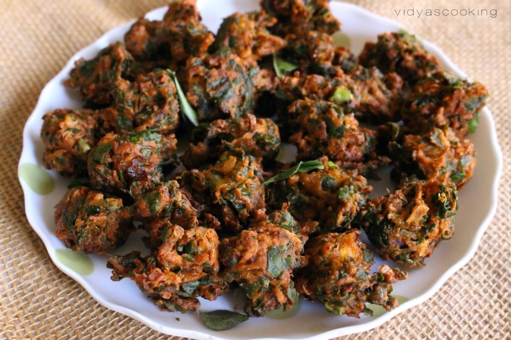 উপকরণ: তাজা পালং শাকের পাতা ১০-১৫টা, চালেরগুঁড়ো ১/৪ কাপ, বেসন ১/৪ কাপ লঙ্কা গুঁড়ো ১/২ চা চামচ, হিং ১/২ চা চামচ, কালো জিরে ১/৪ চা চামচ, নুন ও চিনি স্বাদ মতো, তেল পরিমাণ মতো