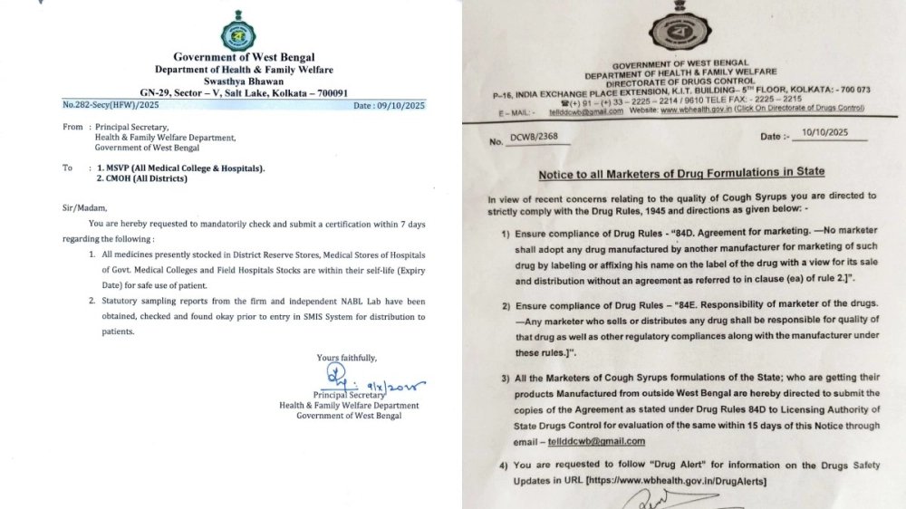 প্রথম নোটিশে রাজ্যে সব ওষুধ বিপণনকারীদের প্রতি বিজ্ঞপ্তি প্রকাশ করে স্বাস্থ্য দপ্তর জানিয়েছে, সাম্প্রতিক কাশিপ সিরাপের মান সংক্রান্ত উদ্বেগের পরিপ্রেক্ষিতে নির্দেশ দেওয়া হচ্ছে যেন নিম্নলিখিত নির্দেশাবলী ও Drugs and Cosmetics Rules, 1945 এর বিধানগুলি কঠোরভাবে মেনে চলা হয়-