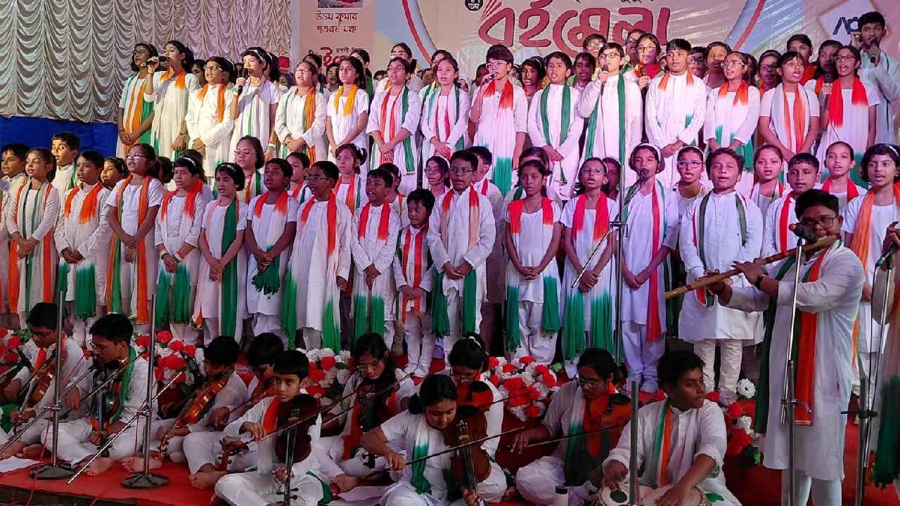 মিল্টন সেন, হুগলি: সাদা পোশাক। গলায় তিরঙ্গা ওড়না। একসঙ্গে ১৫০ খুদে কন্ঠ গেয়ে উঠল। মুখরিত হল 'বন্দে মাতরম'। উঠে দাঁড়ালেন উপস্থিত শ্রোতারা। ভায়োলিনের সুরের মূর্ছনা ছড়িয়ে পড়ল মেলা প্রাঙ্গণে। সরস্বতী বন্দনায় নৃত্য পরিবেশন করলেন ছাত্রীরা। সূচনা হল ১৭ তম হুগলি চুঁচুড়া বই মেলার।