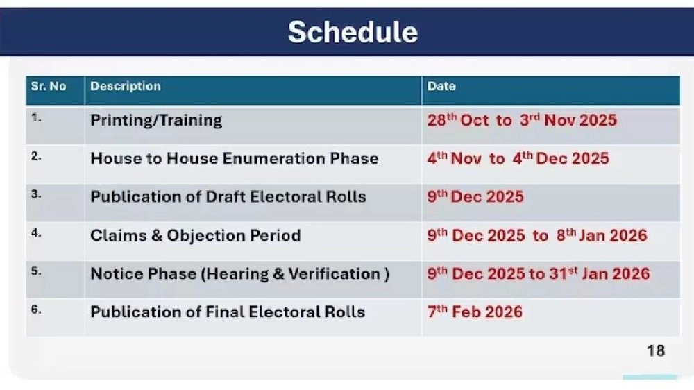 সোমবার বিকেলে দিল্লির বিজ্ঞান ভবনে সাংবাদিক সম্মেলন করে নির্বাচন কমিশন জানিয়ে দিল, সফল প্রথম দফার এসআইআর। পশ্চিমবঙ্গে এসআইআর শুরু হবে আগামিকাল থেকে। ৪ নভেম্বর থেকে ৪ ডিসেম্বর চলবে এনুমারেশন ফর্ম প্রক্রিয়া। ৯ ডিসেম্বর খসড়া ভোটার তালিকা প্রকাশ। ৯ ডিসেম্বর থেকে ৩১ জানুয়ারি অভিযোগের ভিত্তিতে শুনানি, ৭ ফেব্রুয়ারি চূড়ান্ত ভোটার তালিকা প্রকাশ করবে নির্বাচন কমিশন।