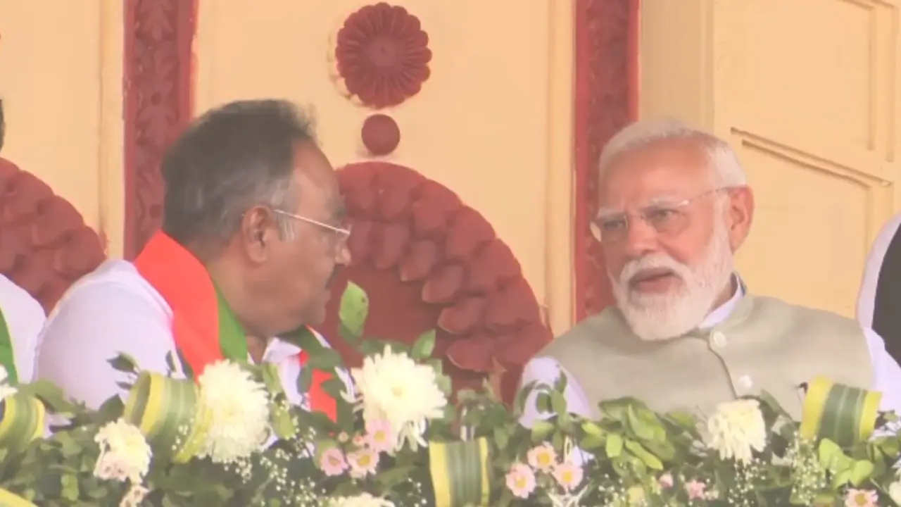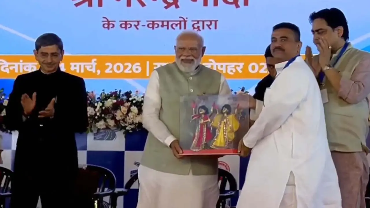 ব্রিগেডে বিজেপির সভামঞ্চে প্রধানমন্ত্রী মোদি। রজনীগন্ধার মালা পরিয়ে স্বাগত জানালেন শুভেন্দু অধিকারী। কথা বললেন রাজ্য বিজেপি সভাপতি শমীক ভট্টাচার্যও। মোদির হাতে বঙ্কিমচন্দ্র চ্যাটার্জির ছবি তুলে দেন শমীক ভট্টাচার্য।
