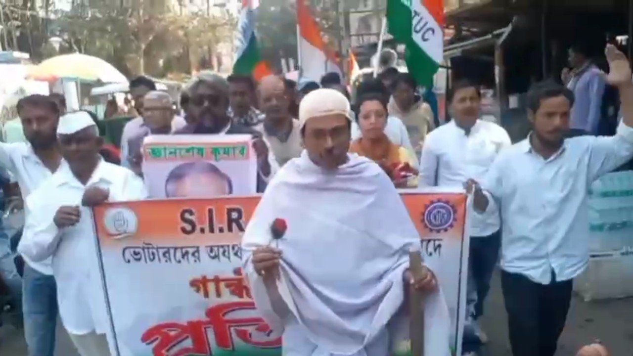 কংগ্রেস নেতা গৌরব সমাদ্দার জানান, ভোর থেকে রাত পর্যন্ত মানুষের যে হয়রানি চলছে, তাতে এটুকু নায্য। মানুষের স্বার্থে তাদের এই গান্ধীগিরি। একই কথা জানালেন গান্ধীর বেশে থাকা আসা কংগ্রেসের তরুণ কর্মী শান্তনু ঘোষ।