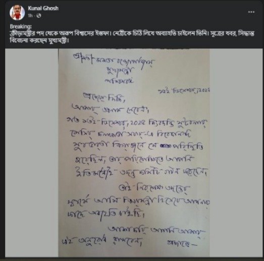তেমনটাই পোস্ট করেছেন তৃণমূল নেতা কুণাল ঘোষ। সঙ্গে হাতে লেখা একটি চিঠিও সোশ্যাল মিডিয়ায় পোস্ট করেছেন তিনি। সোশ্যাল মিডিয়ায় এমনটাই জানিয়েছেন কুণাল ঘোষ। কুণালের পোস্ট অনুযায়ী অরূপ বিশ্বাস ১৫ ডিসেম্বর এই চিঠিটি লিখেছেন। সূত্রের খবর, সিদ্ধান্ত বিবেচনা করছেন মুখ্যমন্ত্রী। কুণাল পোস্টে লিখেছেন, ‘সূত্রের খবর সিদ্ধান্ত বিবেচনা করছেন মুখ্যমন্ত্রী’।