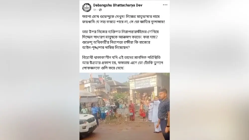 ইতিমধ্যে তৃণমূলের যুবনেতা শুভেন্দুর ওই ভিডিও পোস্ট করেছেন সোশ্যাল মিডিয়ায়। তাতে তিনি লিখেছেন, ‘ক্ষ্যাপা মোষ শুভেন্দুকে দেখুন! নিজের মাতৃভাষার নামে জয়ধ্বনি যে সহ্য করতে পারে না, সে তো জাতির কুলাঙ্গার! তার উপর নিজের ব্যক্তিগত নিরাপত্তারক্ষীদের লেলিয়ে দিচ্ছেন সাধারণ মানুষকে আক্রমণ করতে! করা যায়? শুভেন্দু অধিকারীর নিরাপত্তা রক্ষীরা কি রাজ্যের আইন-শৃঙ্খলার দায়িত্ব নিয়েছেন? বিরোধী থাকাকালীন যদি এই তাদের মানসিক পরিস্থিতি আর উগ্রতার প্রকাশ হয়, ক্ষমতায় এলে তো হেঁচকি তুললে লোকজনকে গুলি করে দেবে!’